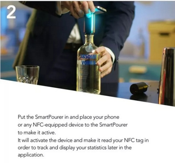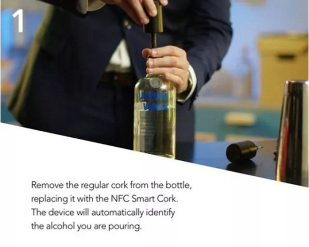 Il dispositivo è così facile da usare che per prima cosa devi rimuovere il tappo della bottiglia e inserire il tappo intelligente NFC Smart Cork fornito con SmartPourer. Il dispositivo identificherà automaticamente il vino che hai versato. Dopodiché puoi montare l'ontologia di SmartPourer e attivarla con il tuo telefono o qualsiasi dispositivo NFC.