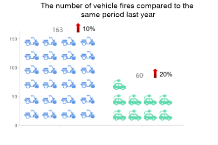 Secondo i dati dei vigili del fuoco del Guangdong, si sono verificati 163 incendi di biciclette elettriche. nel primo trimestre del 2022 , un anno dopo- aumento annuo del 10% e 60 incendi di veicoli elettrici o ibridi, con un aumento del 20% rispetto all'anno precedente.