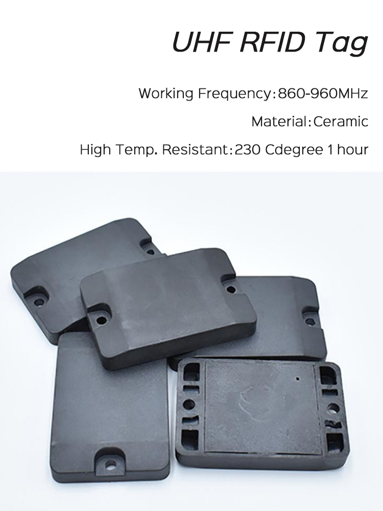 Tag RFID UHF in ceramica resistente alle alte temperature fino a 230 gradi, dimensioni 46*31*7,5 mm, frequenza 860-960 MHz.